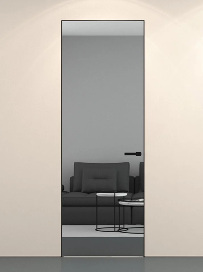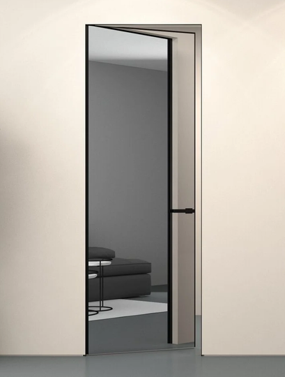Каркасная дверь Hausdoors под покраску на лицевой части, зеркало с другой стороны, открывание наружу. Полотна изготавливаются с фабричной фрезеровкой под замок 196 мм и петли AGB Eclipse 2.2. Со стороны зеркала предусмотрено одно или два отверстия - под ручку и фиксатор/цилиндр. Рекомендуется к установке ручка на круглой розетке диаметром не менее 52 мм.