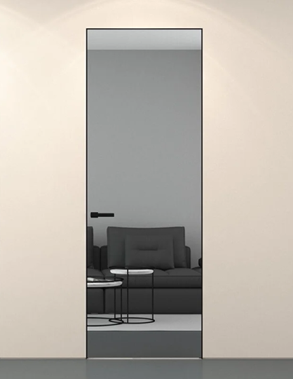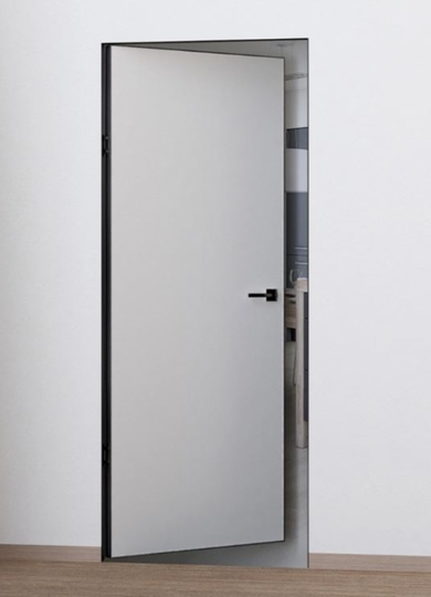 Каркасная дверь Hausdoors под покраску на лицевой части, зеркало с другой стороны, открывание внутрь. Полотна изготавливаются с фабричной фрезеровкой под замок 196 мм и петли AGB Eclipse 2.2. Со стороны зеркала предусмотрено одно или два отверстия - под ручку и фиксатор/цилиндр. Рекомендуется к установке ручка на круглой розетке диаметром не менее 52 мм.