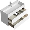 Тумба Aqwella Geometria 100 оснащена двумя выдвижными ящиками на направляющих скрытого монтажа, что обеспечивает плавное скольжение и мягкое закрывание. Фасады и боковины с обработкой торцов под углом 45 градусов создают лаконичность и изящный, почти монолитный силуэт в закрытом состоянии. Все грани имеют округлую фрезеровку, обеспечивая приятные тактильные ощущения при открывании. Внутри ящиков - отделка под светлый камень, боковины выполнены из толстого тонированного стекла, что добавляет коллекции элегантности.