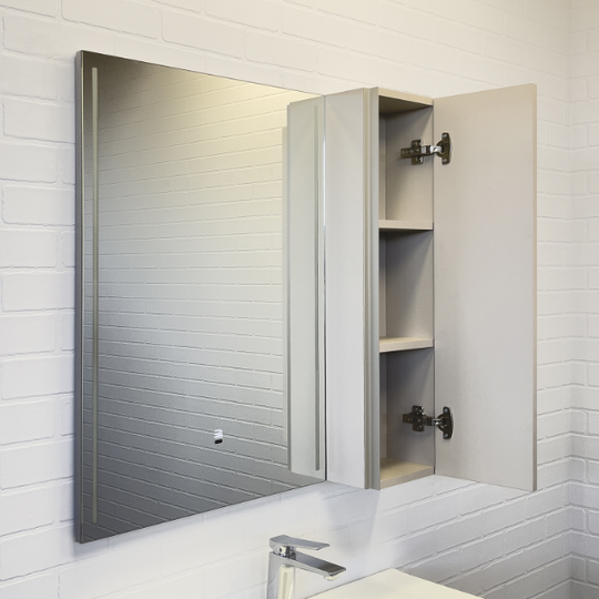 Зеркальное высококачественное полотно с амальгамой на основе серебра. Створка оснащена петлями с системой плавного закрывания. За створкой две полки. Открытие створки производится при помощи вертикальной профильной ручки, интегрированной в левую боковую стенку шкафчика. Зеркало оборудовано фронтальной LED подсветкой с бесконтактным выключателем со встроенной функцией регулировки яркости. Температура подсветки 6000-6500K холодный свет. Зеркало-шкаф выпускается только с правым размещением мебельного элемента.
