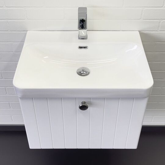 Подвесная тумба Истра 60П с одним широким выдвижным ящиком, оснащенным направляющими Hettich с системой плавного закрывания. Фасад тумбы изготовлен из МДФ, фрезерован вертикальным узором и и облицован пленкой имитирующей текстуру дерева ясень беленый. Внутренние детали из влагостойкого ЛДСП. Ручка из цинкового сплава в цвете состаренный черненый. Тумба подготовлена для подключения водоснабжения снизу и сзади.