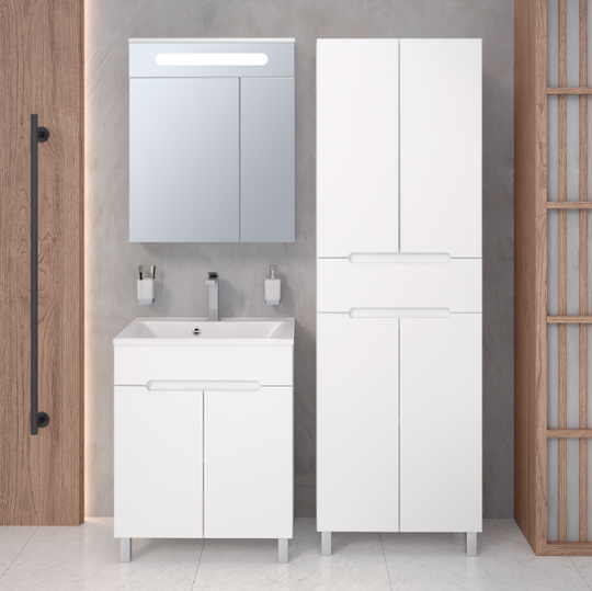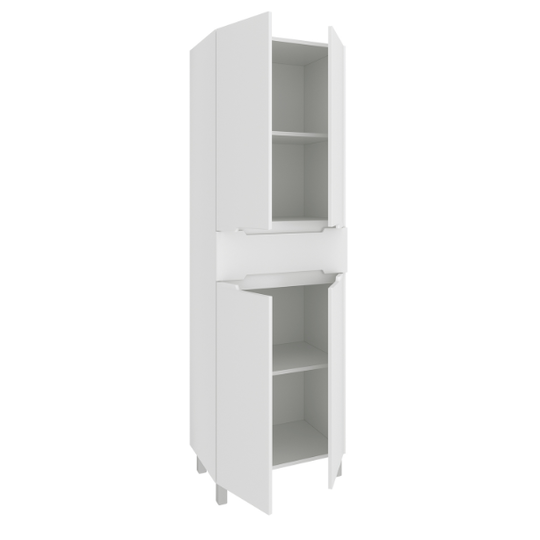 Напольный пенал Olivia оснащен двумя вместительными отделениями с внутренними полками и центральным выдвижным ящиком с механизмом плавного закрывания. Петли с доводчиком на дверцах также обеспечивают мягкое и бесшумное закрывание.