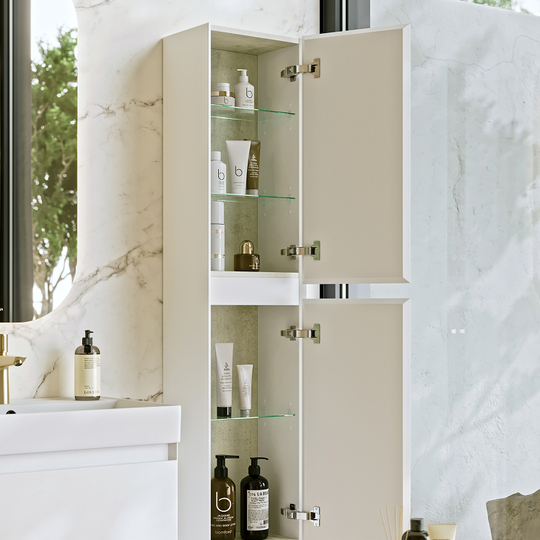Пенал Aqwella Geometria 35 оснащен двумя дверцами на петлях с мягким закрыванием, внутри расположены полочки. Фасады и боковины с обработкой торцов под углом 45 градусов создают лаконичность и изящный, почти монолитный силуэт в закрытом состоянии. Все грани имеют округлую фрезеровку, обеспечивая приятные тактильные ощущения при открывании. Внутри - отделка под светлый камень.