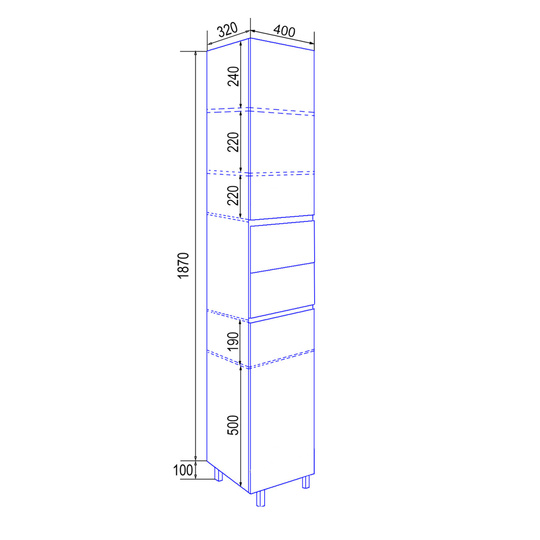 Пенал Azario Эстима 40 оснащен сверху и снизу двумя распашными дверцами на доводчиках, а посередине двумя выдвижными ящиками без доводчиков. В верхнем распашном фасаде две полочки внутри, в нижнем - одна полочка. Пенал установлен на хромированные ножки. Корпус изготовлен из ЛДСП, фасады МДФ толщиной 16 мм. Корпус и фасады производства Kronospan. Бока и фасады крашеные итальянской эмалью.