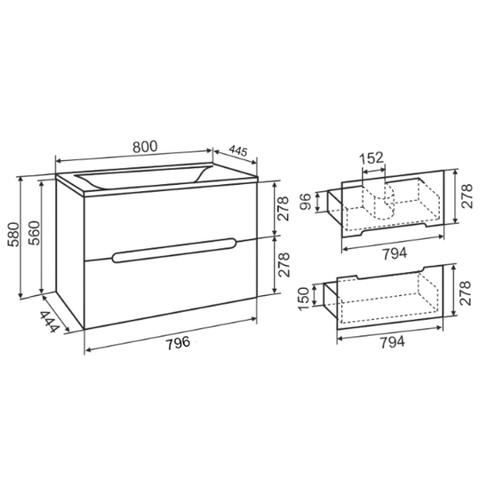 Тумба Olivia 80 оснащена двумя выдвижными ящиками на шариковых направляющих скрытого монтажа с доводчиками. Ящики легко открываются благодаря удобным вырезам на фасаде.