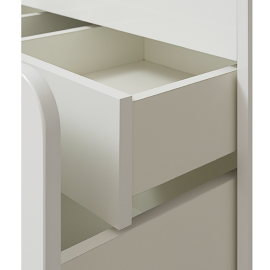 Тумба Skandi 80 оснащена двумя ящиками: внешним и внутренним. Внешний ящик на направляющих скрытого монтажа с доводчиком. Внутренний открывается с помощью механизма Push-to-Open. Корпус тумбы выполнен из ЛДСП, а фасад внешнего ящика - из МДФ. Лаконичным завершением общей композиции является стильная хромированная ручка.