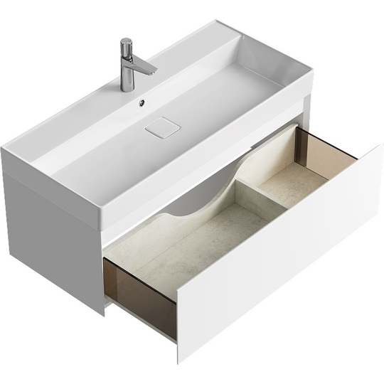 Тумба Aqwella Geometria 100 оснащена одним выдвижным ящиком на направляющих скрытого монтажа, что обеспечивает плавное скольжение и мягкое закрывание. Фасады и боковины с обработкой торцов под углом 45 градусов создают лаконичность и изящный, почти монолитный силуэт в закрытом состоянии. Все грани имеют округлую фрезеровку, обеспечивая приятные тактильные ощущения при открывании. Внутри ящиков - отделка под светлый камень, боковины выполнены из толстого тонированного стекла, что добавляет коллекции элегантности.