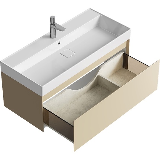 Тумба Aqwella Geometria 100 оснащена одним выдвижным ящиком на направляющих скрытого монтажа, что обеспечивает плавное скольжение и мягкое закрывание. Фасады и боковины с обработкой торцов под углом 45 градусов создают лаконичность и изящный, почти монолитный силуэт в закрытом состоянии. Все грани имеют округлую фрезеровку, обеспечивая приятные тактильные ощущения при открывании. Внутри ящиков - отделка под светлый камень, боковины выполнены из толстого тонированного стекла, что добавляет коллекции элегантности.