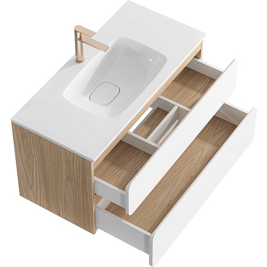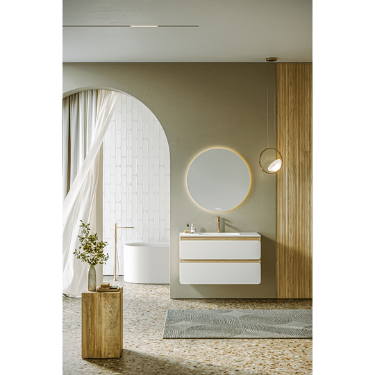 Созданная в стиле софт-минимализма, коллекция Vento отличается мягкой геометрией и визуальной тишиной. Скругленные фасады окрашены матовой краской, также они выполняют функцию скрытых ручек. Древесный корпус из ЛДСП в оттенке светлой акации. Тумбы Vento оснащены умывальниками Malaga из литьевого мрамора, сочетающими четкую геометрию с мягкой пластикой линий. Глубокая практичная чаша обеспечивает комфортность в использовании, а декоративная заглушка в сливной зоне сохраняет чистоту поверхности и архитектурную строгость. Внутреннее пространство продумано до мелочей: дно ящиков выполнено в цвет корпуса, а в верхний ящик установлена система организации внутреннего пространства в виде трех перегородок из ЛДСП.