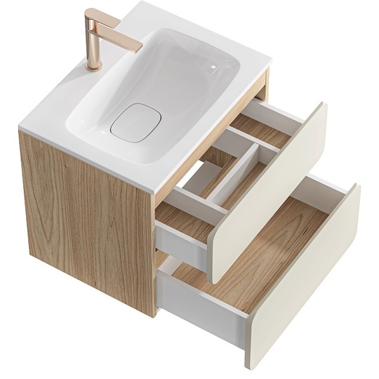 Созданная в стиле софт-минимализма, коллекция Vento отличается мягкой геометрией и визуальной тишиной. Скругленные фасады окрашены матовой краской, также они выполняют функцию скрытых ручек. Древесный корпус из ЛДСП в оттенке светлой акации. Тумбы Vento оснащены умывальниками Malaga из литьевого мрамора, сочетающими четкую геометрию с мягкой пластикой линий. Глубокая практичная чаша обеспечивает комфортность в использовании, а декоративная заглушка в сливной зоне сохраняет чистоту поверхности и архитектурную строгость. Внутреннее пространство продумано до мелочей: дно ящиков выполнено в цвет корпуса, а в верхний ящик установлена система организации внутреннего пространства в виде трех перегородок из ЛДСП.