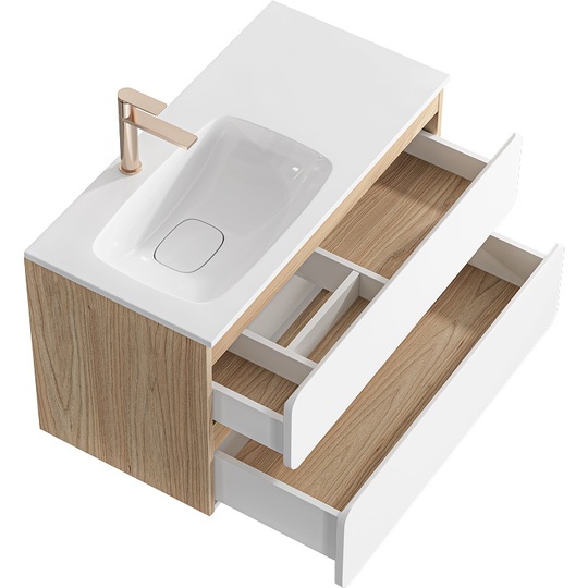 Созданная в стиле софт-минимализма, коллекция Vento отличается мягкой геометрией и визуальной тишиной. Скругленные фасады окрашены матовой краской, также они выполняют функцию скрытых ручек. Древесный корпус из ЛДСП в оттенке светлой акации. Тумбы Vento оснащены умывальниками Malaga из литьевого мрамора, сочетающими четкую геометрию с мягкой пластикой линий. Глубокая практичная чаша обеспечивает комфортность в использовании, а декоративная заглушка в сливной зоне сохраняет чистоту поверхности и архитектурную строгость. Версия тумбы 90 см с асимметричным умывальником, смещенным влево, благодаря чему все необходимое под рукой. Внутреннее пространство тумбы продумано до мелочей: дно ящиков выполнено в цвет корпуса, а в верхний ящик установлена система организации внутреннего пространства в виде трех перегородок из ЛДСП.