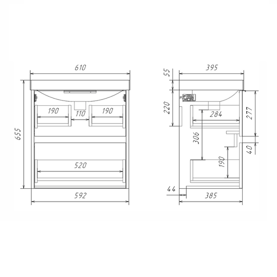 Подвесная тумба Comforty Селенга 60 с двумя вместительными выдвижными ящиками. Направляющие ящиков оборудованы системой плавного закрывания. Верхний ящик открывается черной профильной ручкой. Ручку устанавливать необязательно. Верхний ящик можно открыть за нижний край фасада. Для открытия нижнего ящика нужно потянуть верхний край фасада. Ящики выполнены из ВЛДСП контрастного черного цвета. Тумба подготовлена для подключению коммуникаций снизу и сзади.