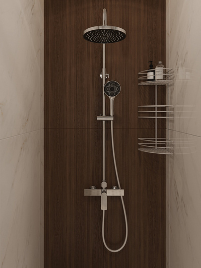 3 режима струи лейки: импульсный, смешанный, тропический; регулировка высоты душевой стойки 115-140 см, защита от перекручивания, защита от обратного потока