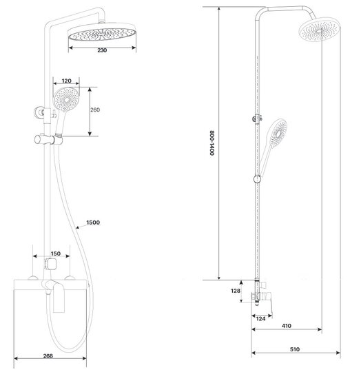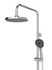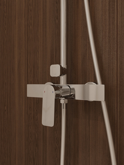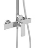 душевая стойка, верхний душ с изменяемым углом (АБС-пластик), лейка (АБС-пластик), держатель для душа, пластиковый шланг в двойной оплетке, смеситель, эксцентрик