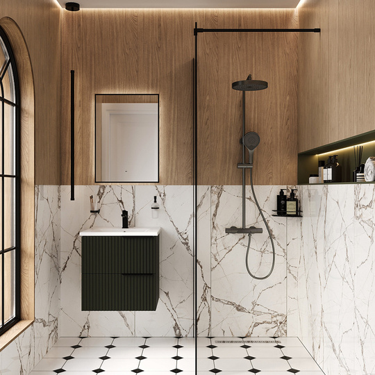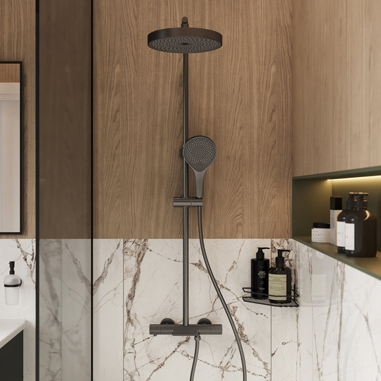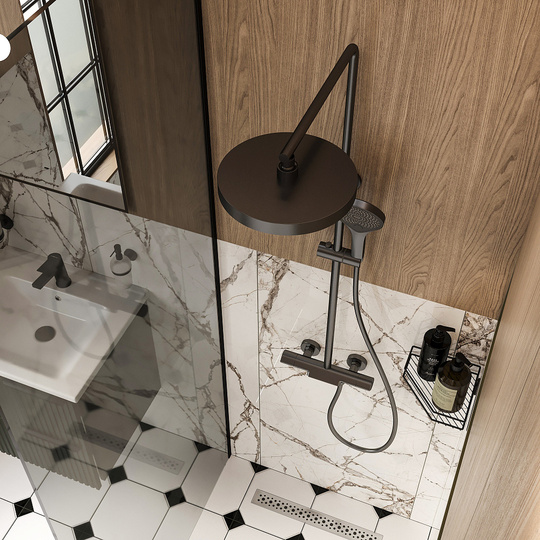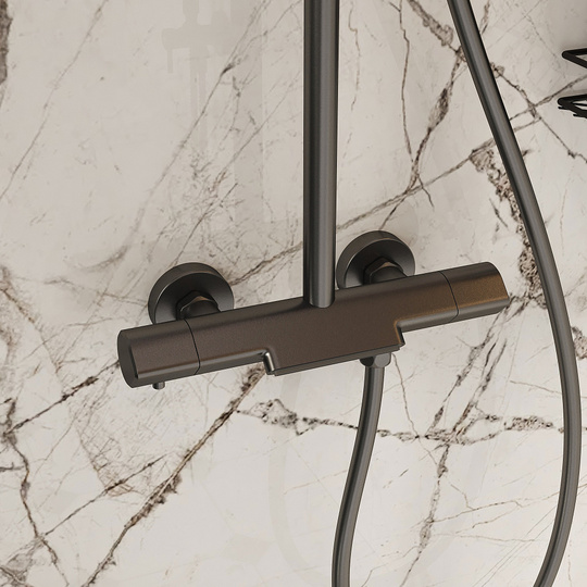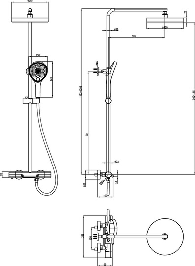 3 режима струи, верхний душ с системой легкой очистки, защита от ожогов (стопор на 38 градусах), регулируемая высота стойки, защита от перекручивания, защита от обратного потока